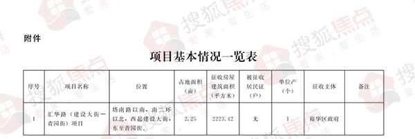 具体来看,汇华路(建设大街—青园街)项目位置为塔南路以南、南二环以北、西起建设大街,东至青园街。占地面积2.25亩,征收房屋建筑面积2223.42平方米,征收主体为裕华区政府。