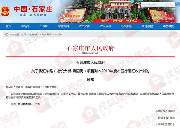 搜狐焦点“楼市快讯”报道:搜狐焦点获悉,石家庄市人民政府发布了《关于将汇华路(建设大街-青园街)项目列入2019年度市区房屋征收计划的通知》。