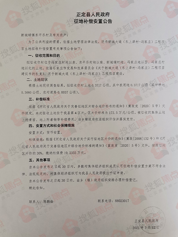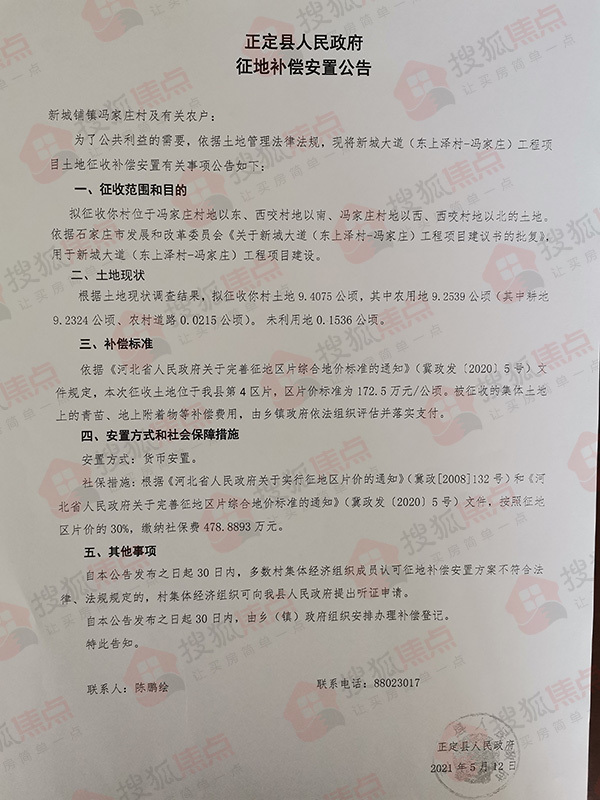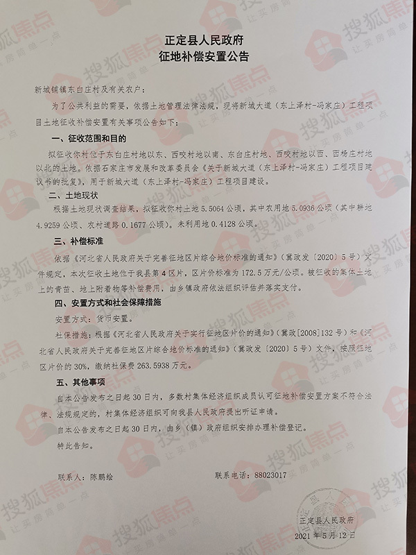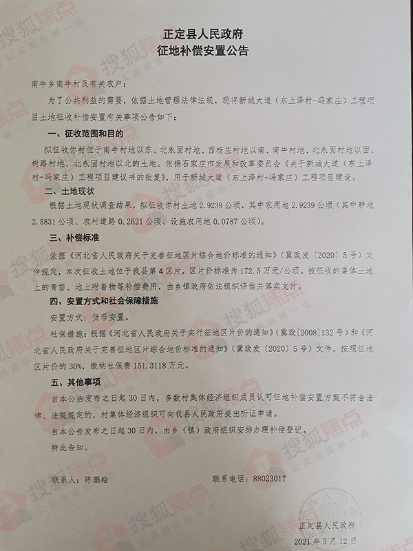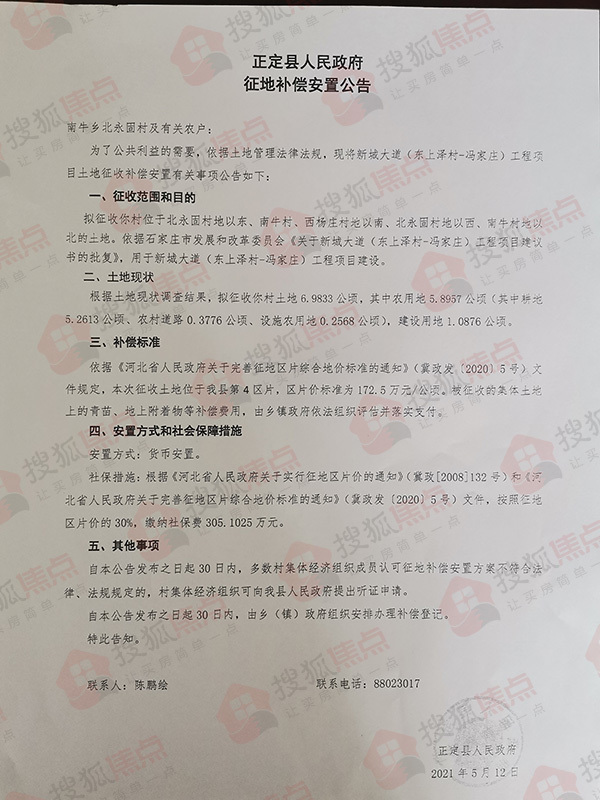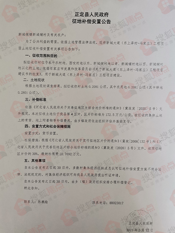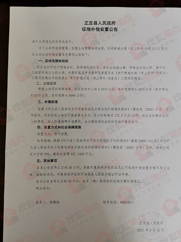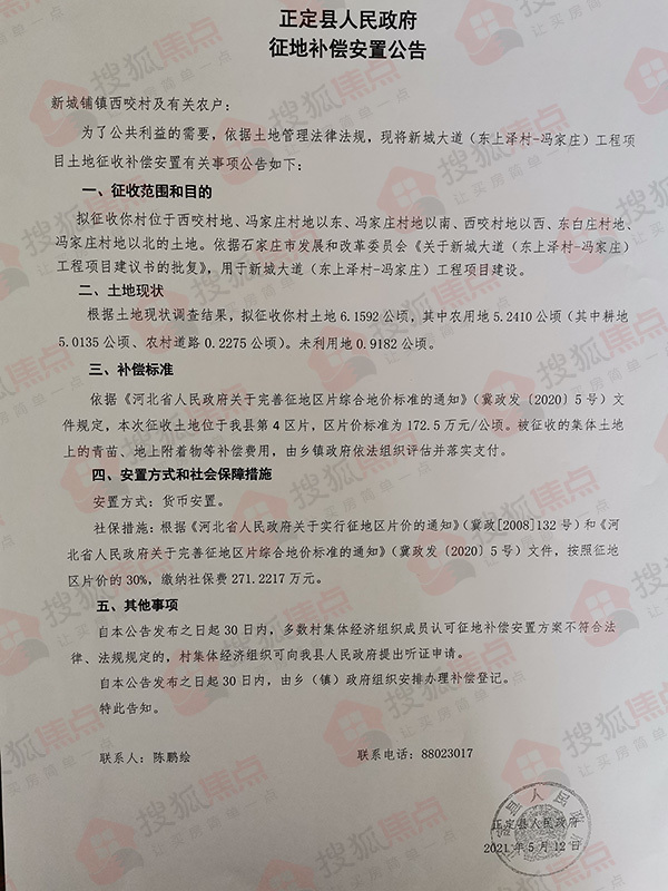 搜狐焦点“楼市快讯”报道:5月13日,搜狐焦点获悉,正定县人民政府连发10则征地补偿安置公告,涉及东白庄村、东平乐村、冯家庄村、西咬村、新城铺村、杨庄村、树路村、南牛村、东洋村、北永固村共计60.0436公顷(约合900.654亩)土地,用于新城大道(东上泽村—冯家庄)工程项目建设。