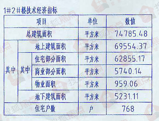根据技术经济指标显示,项目总建筑面积74785.48平方米,其中地上建筑面积69554.37平方米(住宅部分面积62855.17平方米,商业部分面积5740.14平方米,物业面积959.06平方米),地下建筑面积5231.11平方米,住宅户数768户。