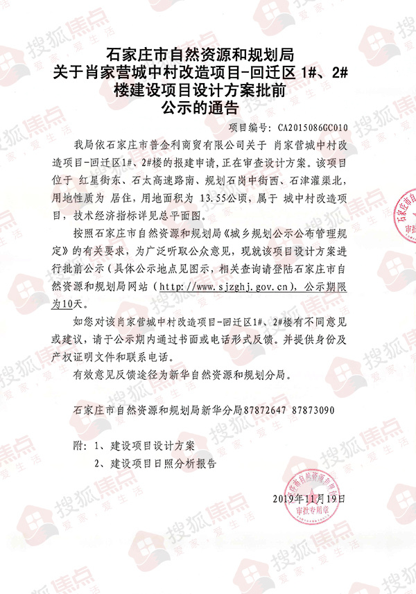 搜狐焦点“楼市快讯”报道:11月20日,搜狐焦点获悉,石家庄市自然资源和规划局发布《关于肖家营城中村改造项目-回迁区1#、2#楼建设项目设计方案批前公示的通告》。