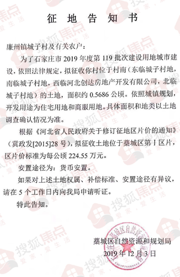 搜狐焦点“楼市快讯”报道:12月3日,搜狐焦点获悉,藁城区自然资源和规划局发布一则征地告知书。