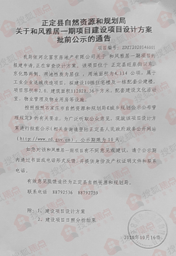 搜狐焦点“楼市快讯”报道:10月19日,搜狐焦点获悉,正定县自然资源和规划局发布《关于和风雅居一期项目建设项目设计方案批前公示的通告》。
