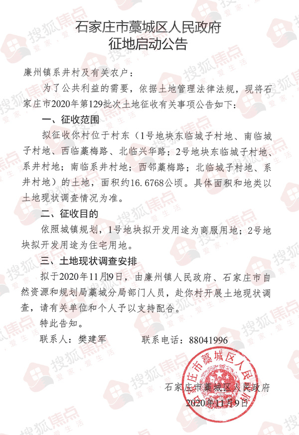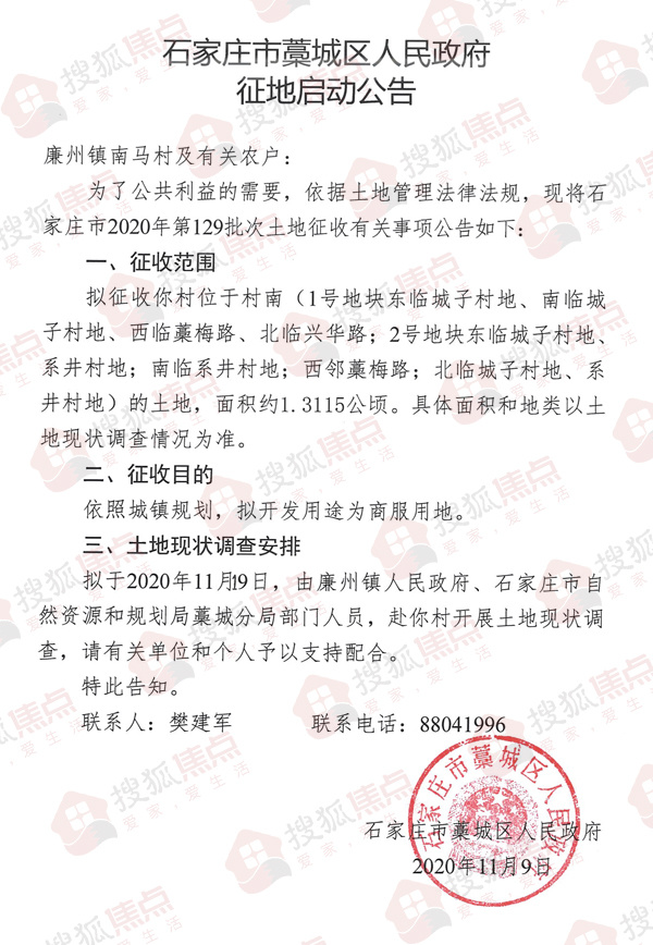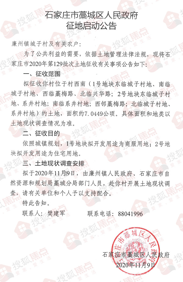 搜狐焦点“楼市快讯”报道:11月10日,搜狐焦点获悉,石家庄市藁城区人民政府发布了3则征地公告,涉及廉州镇城子村、廉州镇系井村、廉州镇南马村25.0332公顷(约合375.498亩)的土地,开发用途为商服用地、住宅用地。