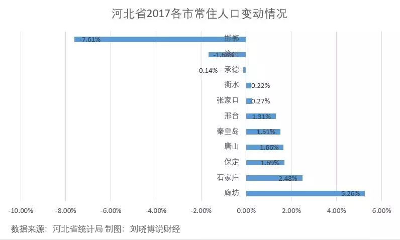 邯郸常住人口流失严重,为-7.61%,沧州和承德都出现人口流失现象;