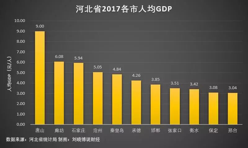 从人均GDP上来看,唐山(9万元/人)依旧排在首位,廊坊(6.08万元/人)略胜石家庄(5.94万元/人),衡水、保定和邢台较低(3万元/人)左右。