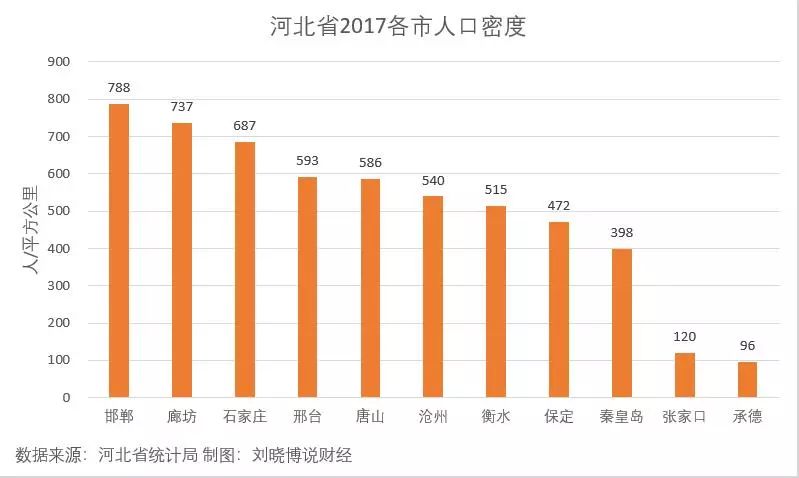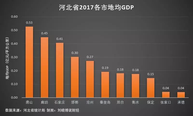 从数据上看,较高的唐山也仅为0.53亿元/平方公里,整个河北省没有接近1亿元/平方公里的城市,说明河北省的经济质量不高,高端产业、高端服务业不占主导;