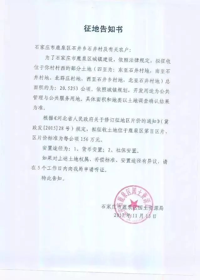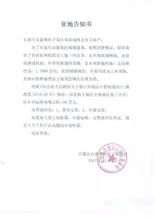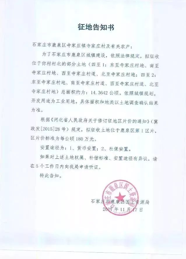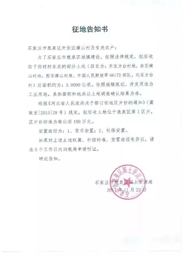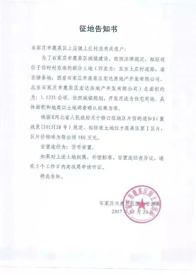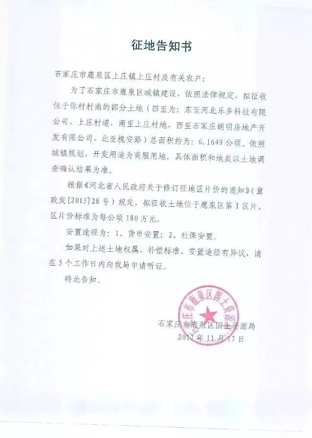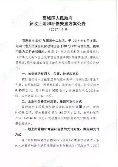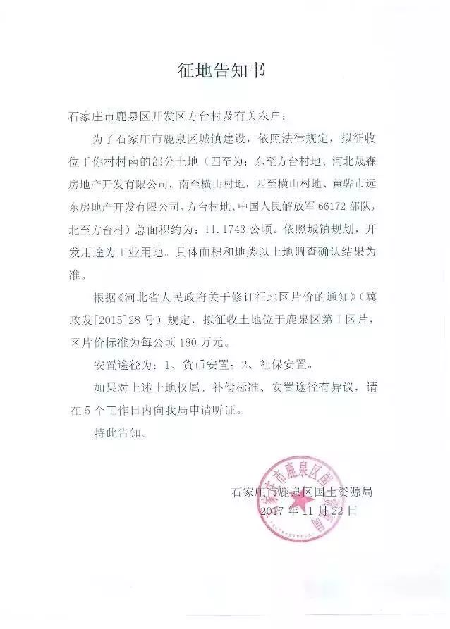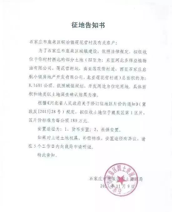 征收范围:东至河北多祥益植物油有限公司、莲花营村地,南至莲花营道,西至石家庄启航小镇房地产开发有限公司,北至莲花营村道。位于鹿泉区排名前列区片,区片价标准为每公顷180万元。