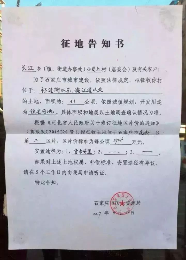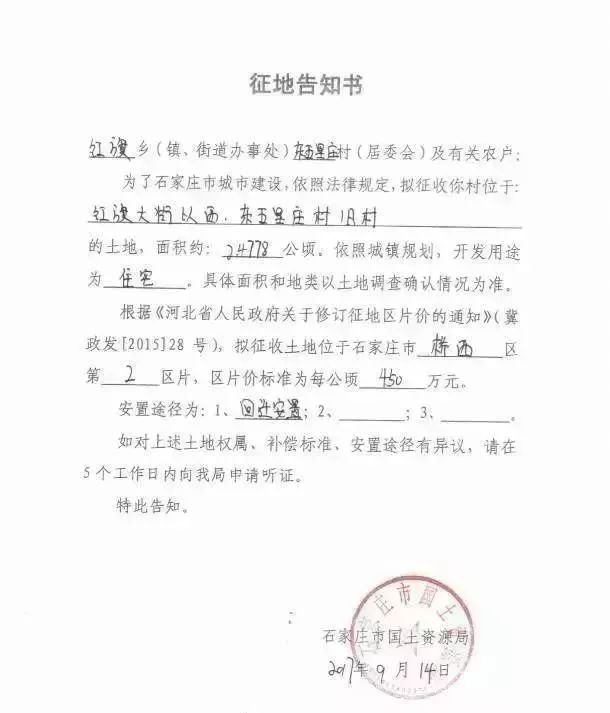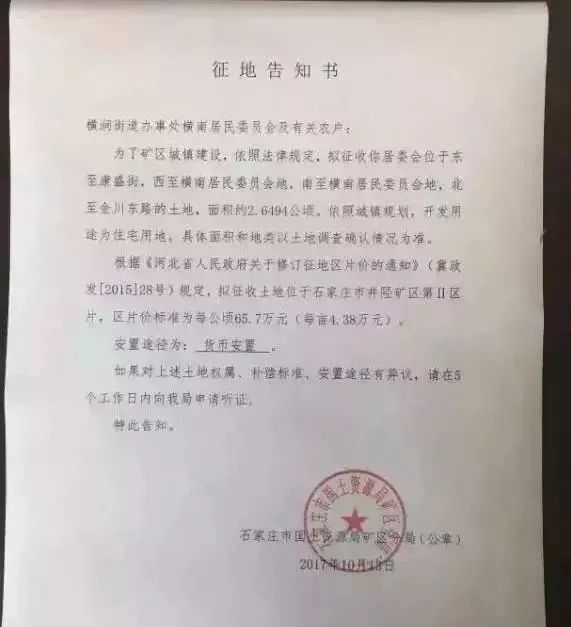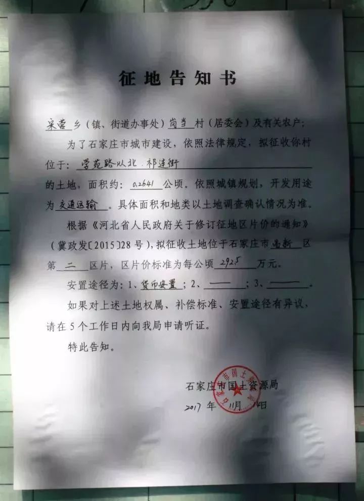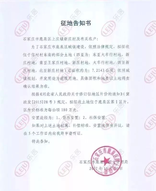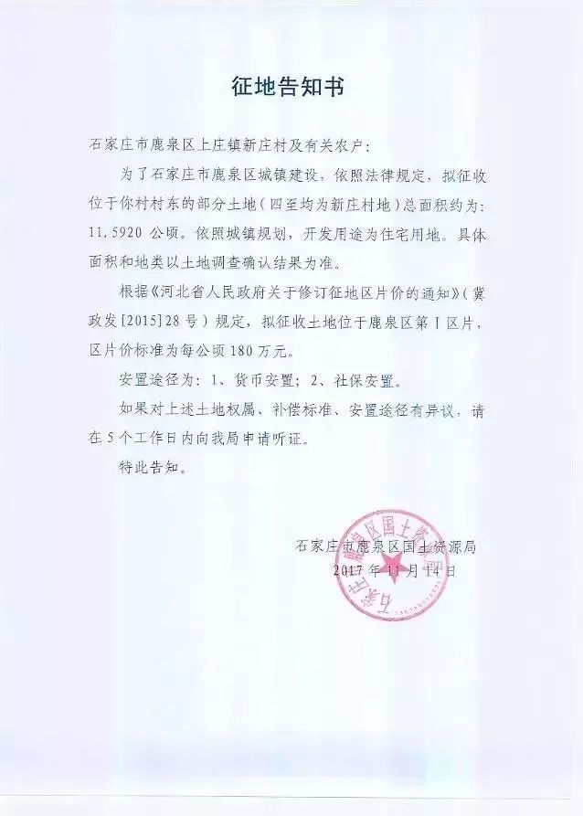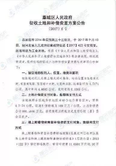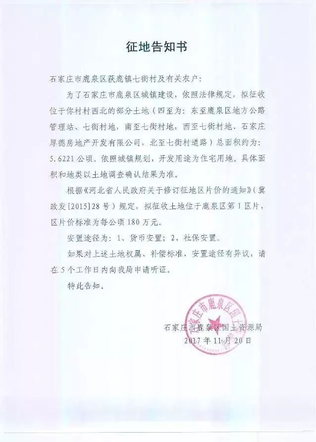 征收范围:东至河北多祥益植物油有限公司、莲花营村地,南至莲花营道,西至石家庄启航小镇房地产开发有限公司,北至莲花营村道。位于鹿泉区排名前列区片,区片价标准为每公顷180万元。