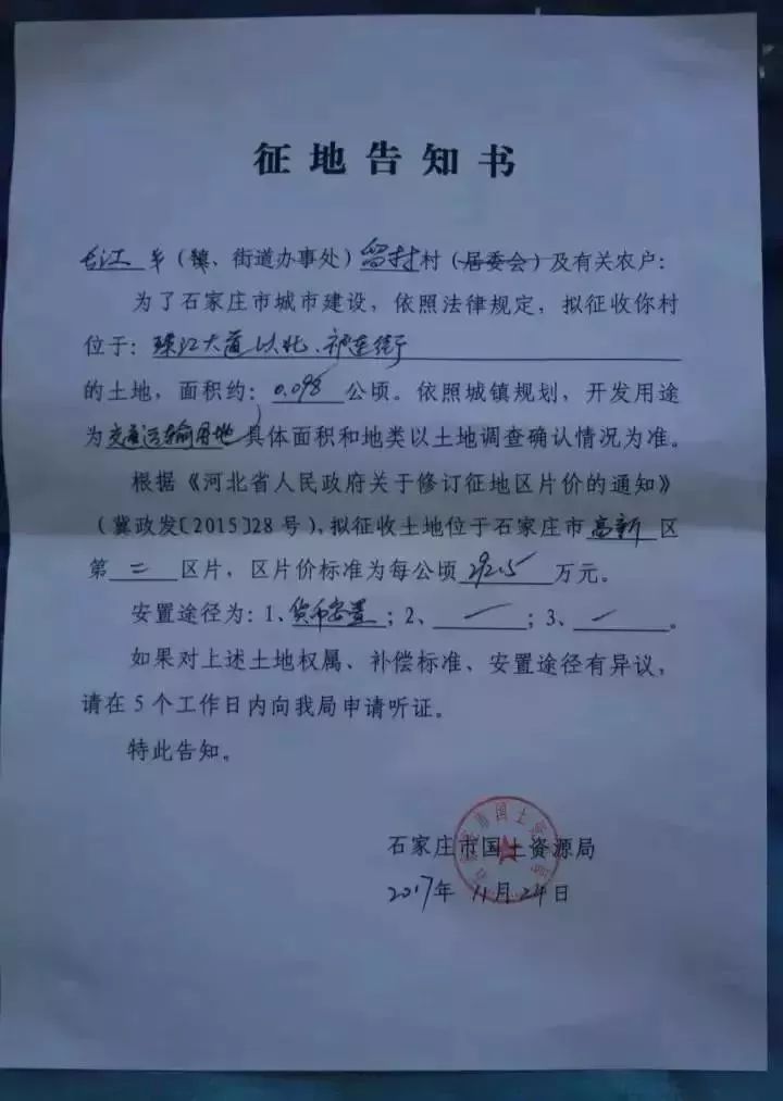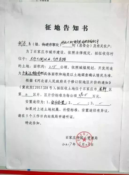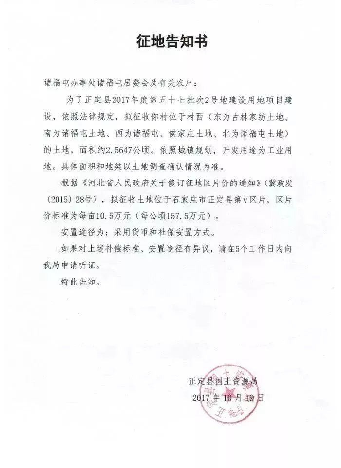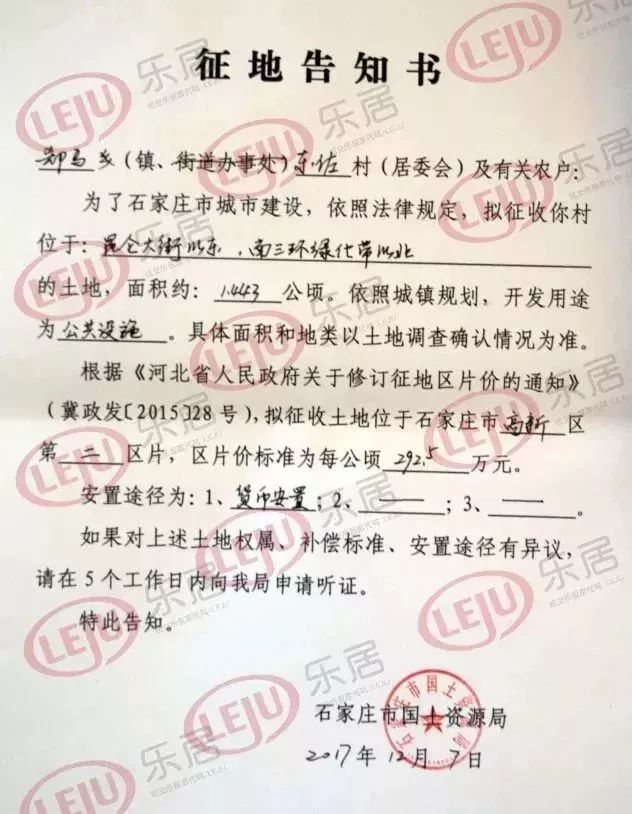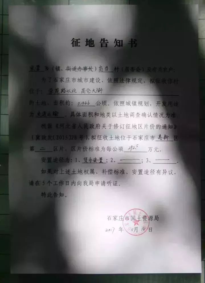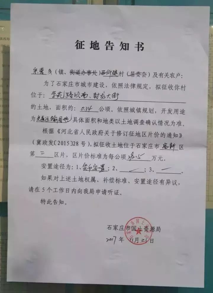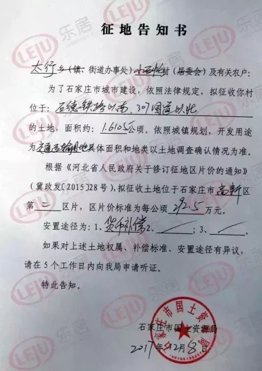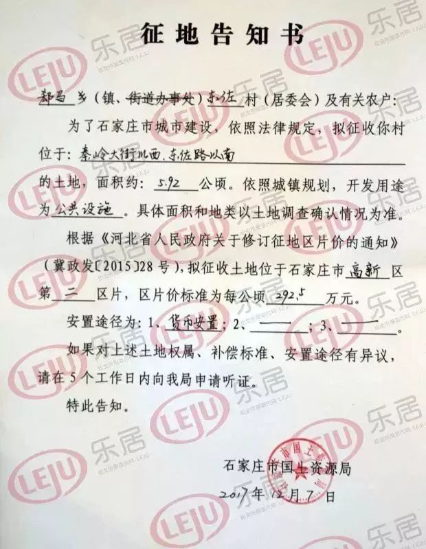 征收范围:东至河北多祥益植物油有限公司、莲花营村地,南至莲花营道,西至石家庄启航小镇房地产开发有限公司,北至莲花营村道。位于鹿泉区排名前列区片,区片价标准为每公顷180万元。