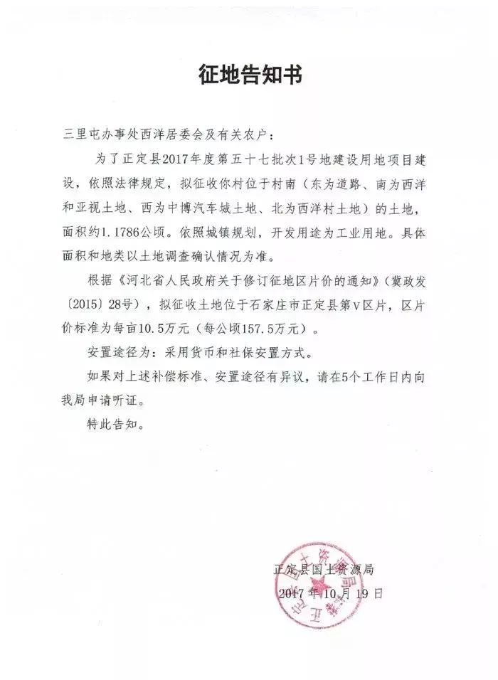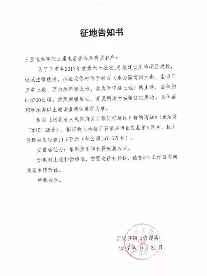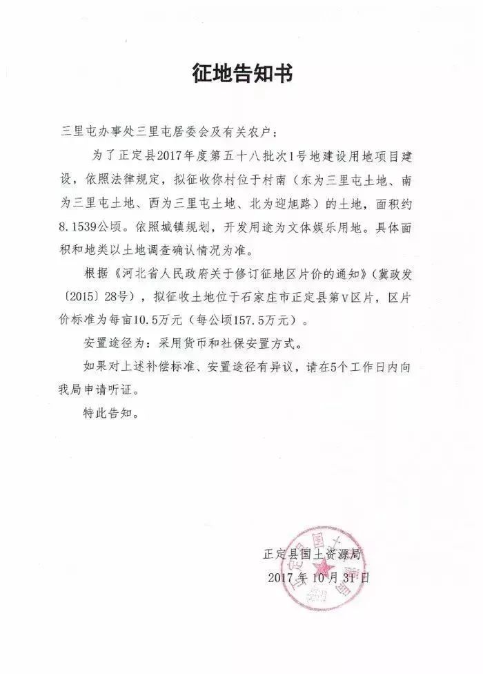 征收范围:三里屯村村南(东为三里屯土地、南为三里屯土地、西为三里屯土地、北为迎旭路)的土地,面积约8.1539公顷,开发用途为文体娱乐用地。征收土地位于石家庄市正定县第Ⅴ片区,区片价标准为每亩10.5万元(每公顷157.5万元)。安置途径为采用货币和社保安置方式。