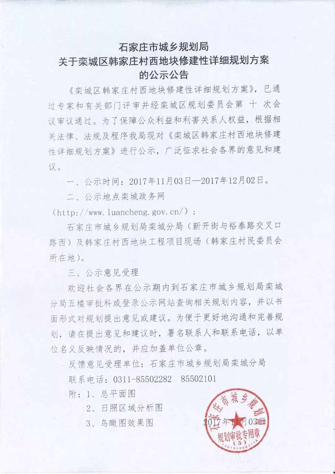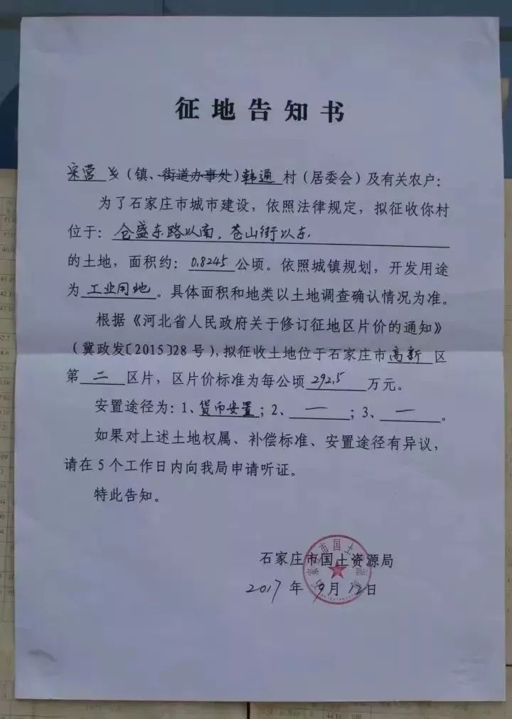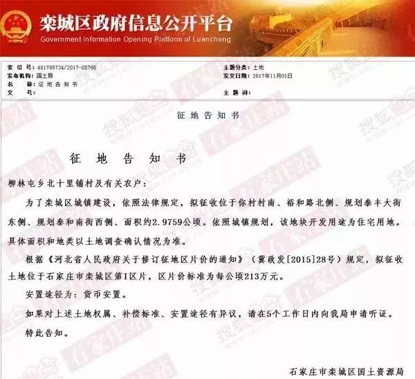 征收范围:北十里铺村村南、裕和路北侧、规划泰丰大街东侧、规划泰和南街西侧、面积约2.9759公顷,约合44.64亩。拟征收土地位于石家庄市栾城区第I区片,区片价标准为每公顷213万元。安置途径为:货币安置。