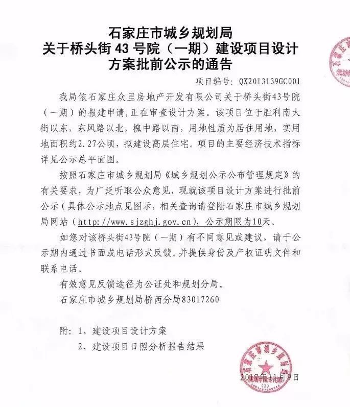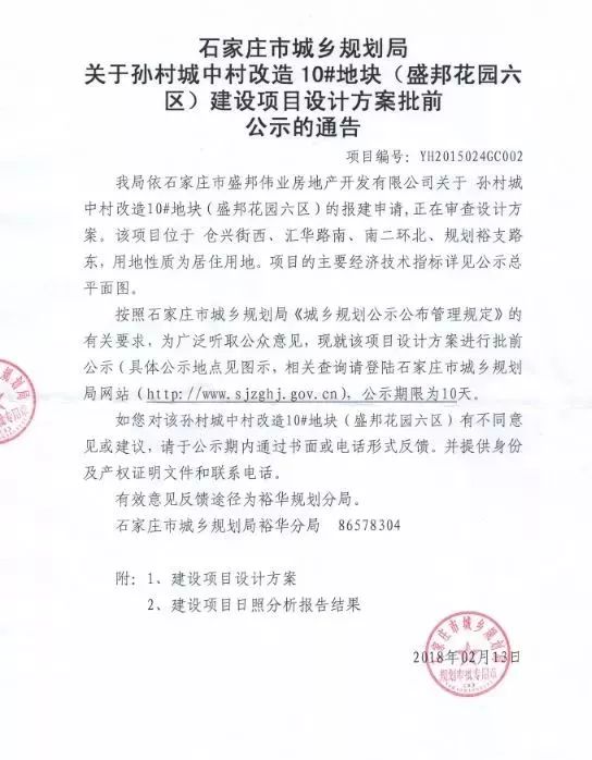 石家庄市城乡规划局发布了关于孙村城中村改造10#地块(盛邦花园六区)建设项目设计方案批前公示的通告。