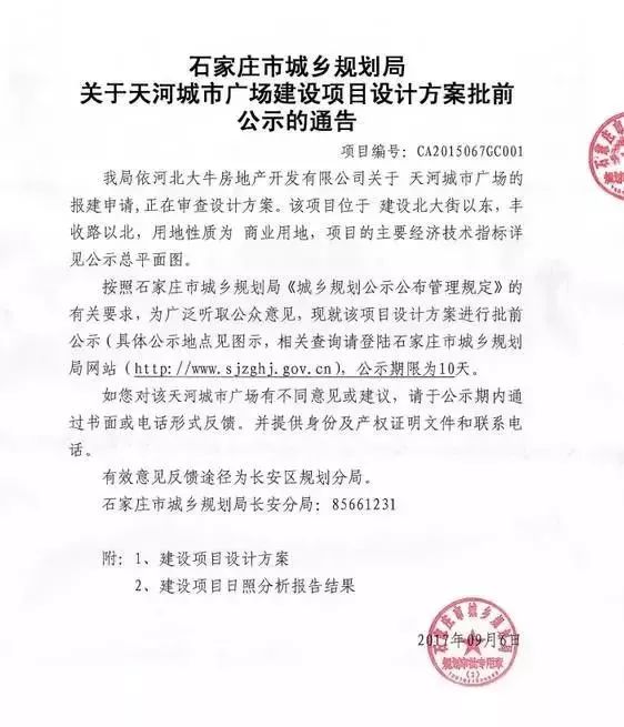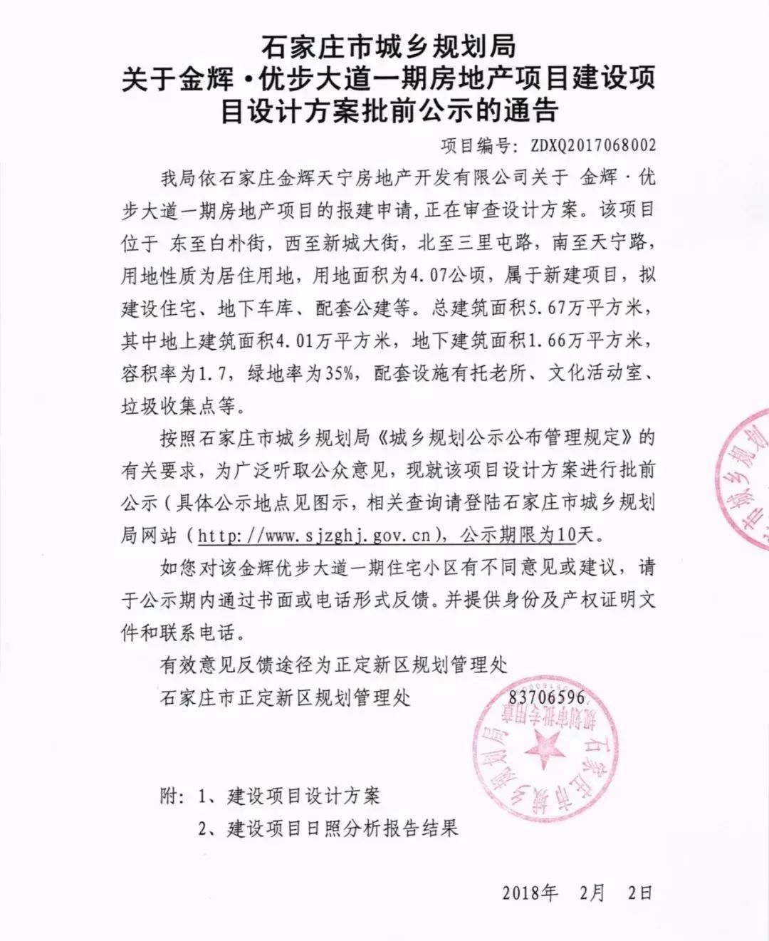 石家庄市城乡规划局发布了《关于金辉.优步大道一期房地产项目建设项目设计方案批前公示的通告》。《通告》显示,金辉优步大道由石家庄金辉天宁房地产开发有限公司报建申请,目前正在审查设计方案。