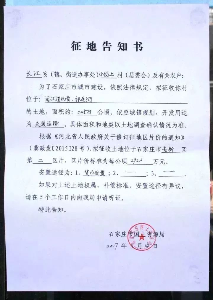 小岗上村其中一宗征收土地范围为闽江道以南、祁连街,面积约0.4538公顷,约合6.81亩,开发用途为交通运输用地。拟征收土地位于石家庄市高新区第2片区,区片价标准为每公顷292.5万元,安置途径为货币安置。