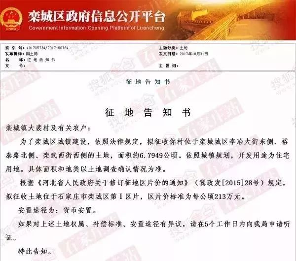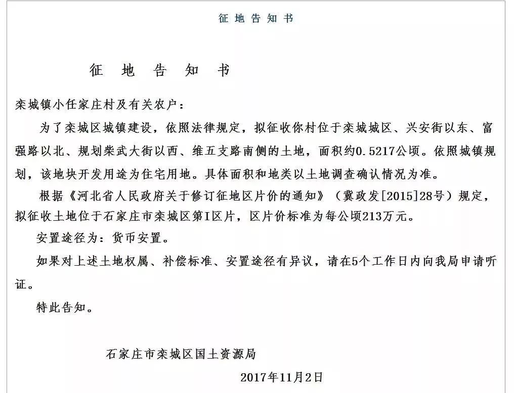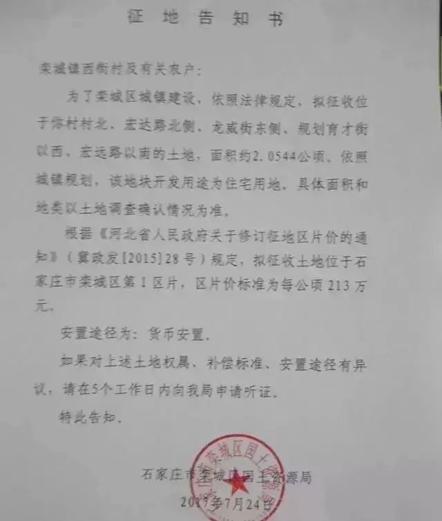 拟征收位于栾城城区李冶大街东侧、裕泰路北侧、栾武西街西侧的土地,面积约6.7949公顷。依照城镇规划,开发用途为住宅用地。拟征收土地位于石家庄市栾城区第Ⅰ区片,区片价标准为每公顷213万元。安置途径为:货币安置。