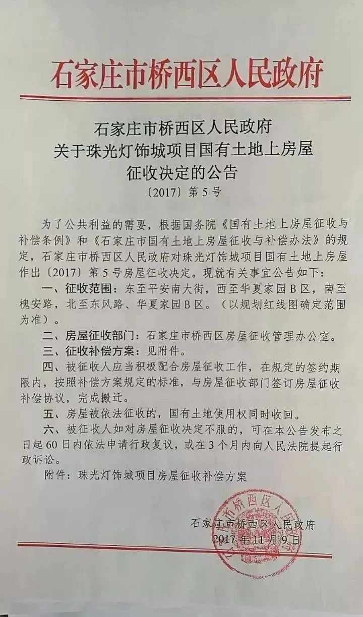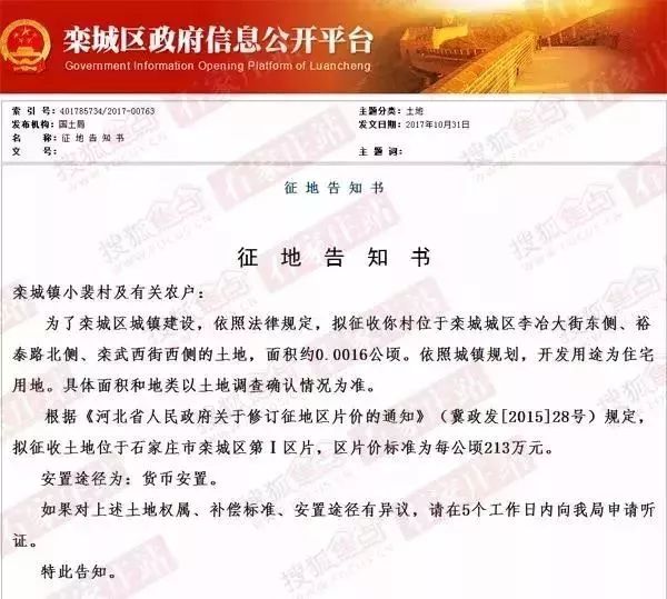 征收范围:栾城城区李冶大街东侧、裕泰路北侧、栾武西街西侧土地,面积约0.0016公顷,约合0.024亩。拟征收土地位于石家庄市栾城区第Ⅰ区片,区片价标准为每公顷213万元。安置途径为:货币安置。