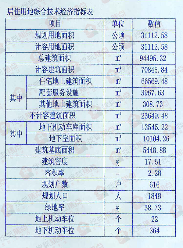 根据居住用地综合技术经济指示表显示,总建筑面积94495.32平方米,建筑密度17.51%,容积率2.28,规划户数616户,规划人口1848人,绿地率38.73%,地上机动车位22个,地下机动车位364个。