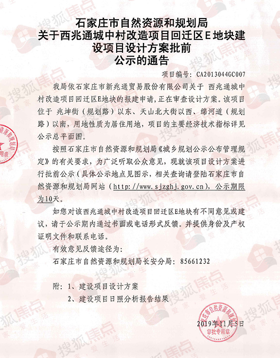 搜狐焦点“楼市快讯”报道:11月8日,搜狐焦点获悉,石家庄市自然资源和规划局发布《关于西兆通城中村改造项目回迁区E地块建设项目设计方案批前公示的通告》。