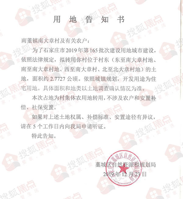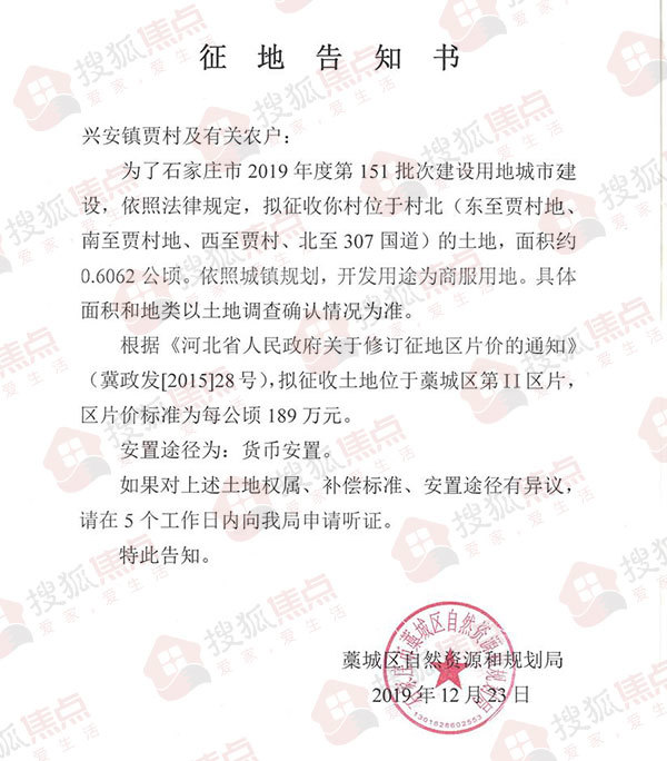 搜狐焦点“楼市快讯”报道:12月23日,搜狐焦点据藁城区政府网站了解,藁城区自然资源和规划局发布了两则征地告知书,涉及贾村及南大章村共计50.6835亩土地。