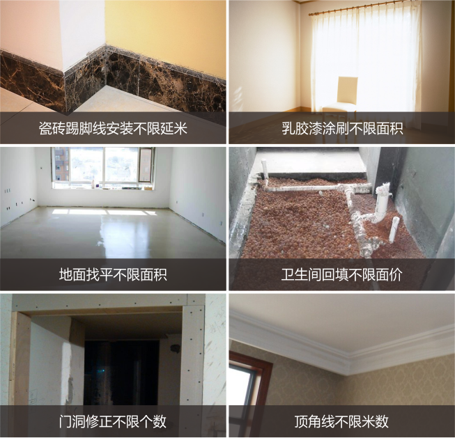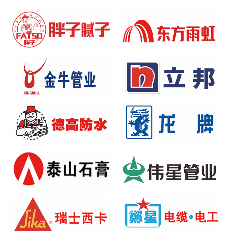 辅材品牌:郑星(三厂)强电线、西门子(电视、网络)弱电线、金牛水电管件、胖子内墙专用腻子、立邦乳胶漆、东方雨虹防水、泰山石膏板