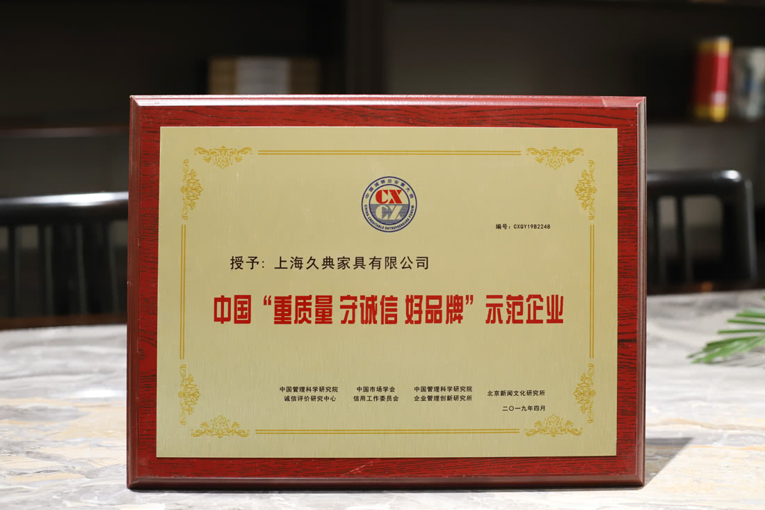 你若盛开,蝴蝶自来。上海久典家具有限公司凭借多年在家具领域管理创新和诚信兴商的突出贡献和优秀成果,正式荣获“中国‘重质量 守诚信 好品牌’示范企业”和“中国家具行业十大诚信品牌”,大会现场发布表彰并颁发奖牌证书,久典家具获此殊荣,既是行业及社会对其一直秉持“诚信为本、用心服务”经营理念的认可,也是广大客户对久典家具专业、专注精神的信任与支持。
