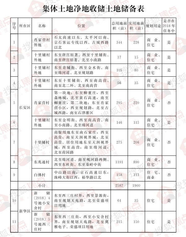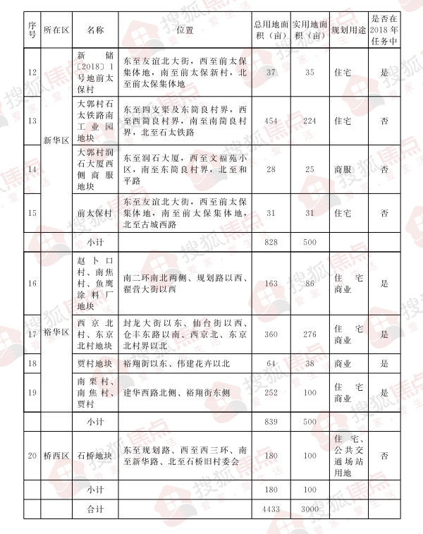 《通知》显示,本计划的行政区划范围为桥西区、裕华区、长安区、新华区、高新区、藁城区、栾城区。计划储备的土地主要为企事业单位国有土地、城中村改造项目土地、旧城改造项目土地和市内四区集体土地3000亩净地收储。全年计划完成土地储备面积合计15994亩,其中: