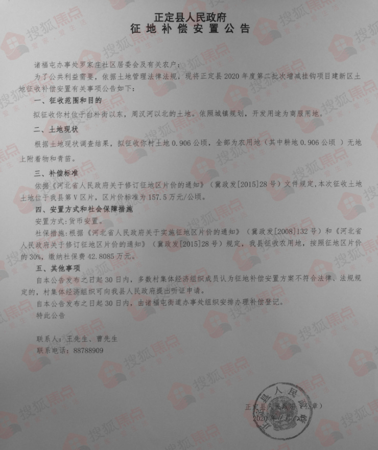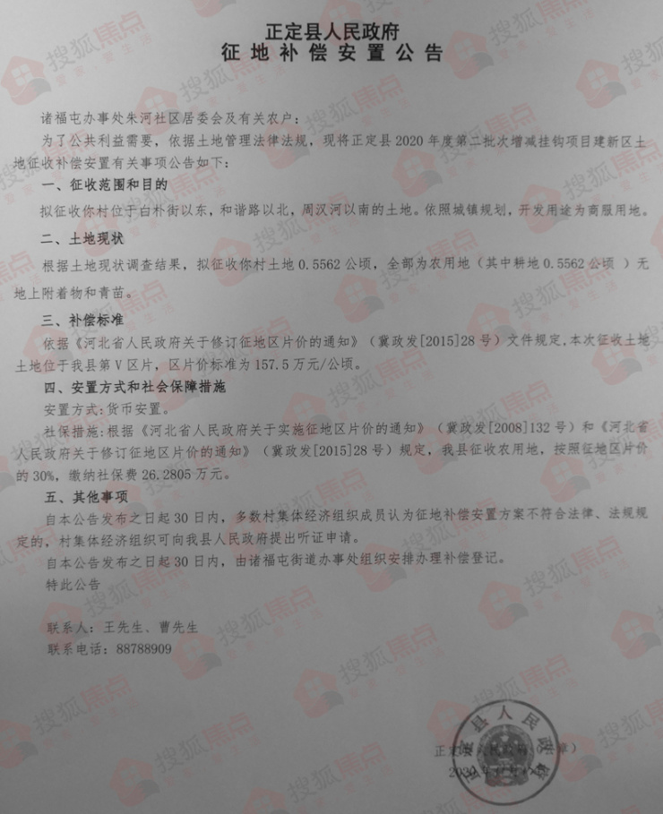 公告显示,拟征收诸福屯办事处朱河社区居委会0.5562公顷(约合8.343亩)的土地,地块位于白朴街以东,和谐路以北,周汉河以南。按照城镇规划,拟开发用途为商服用地。本次征收土地位于正定县第Ⅴ区片,区片价标准为157.5万元/公顷。安置方式为货币安置。