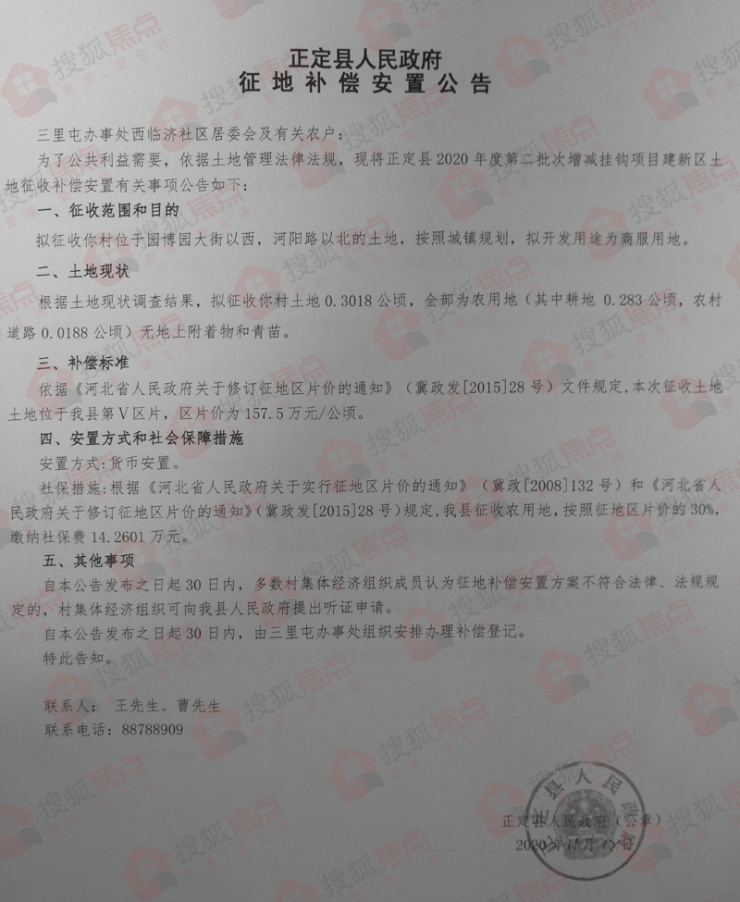 拟征收三里屯办事处西临济社区居委会0.3018公顷(约合4.527亩)的土地,地块位于园博园大街以西,河阳路以北。按照城镇规划,拟开发用途为商服用地。本次征收土地位于正定县第Ⅴ区片,区片价标准为157.5万元/公顷。安置方式为货币安置。