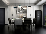 石家庄装修公司对于特殊风格的餐厅是怎么设计的,尤其是一些工业、极简、日式风格都是最近年轻人比较喜欢的风格,那这些风格该如何设计餐厅呢? 就像下图,这个风格是高级灰的风格,餐厅并没有很暖的颜色,包括地板都是深色系的,餐厅一般设计师都会建议使用暖色调,但是如果在高级灰的案例里面餐厅做成暖色调整个空间又会