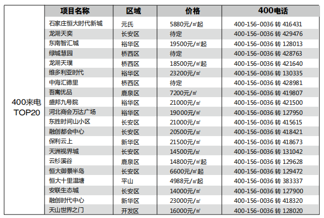 根据搜狐焦点统计显示6月搜狐焦点400来电环比下降6.3%。6月来电量排名前20的房地产项目分别为:石家庄恒大时代新城、龙湖天奕、东南智汇城、绿城慧园、龙湖天璞、维多利亚时代、中海汇德里、吾寓优品、盛邦九号院、河北商会万达广场、东胜时间山小区、融创都会中心、保利云上、天洲视界城、云杉溪谷、恒大御景半岛、恒大十里温塘、安联生态城、融创未来中心、天山世界之门,主要集中在主城区。