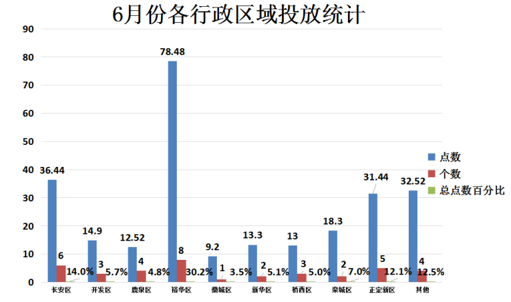 按区域划分的楼盘广告投放量统计来看,2021年6月裕华区有8个楼盘进行广告投放,以总计78.48点的广告投放量位于首位,长安区有6个楼盘以36.44点的广告投放量居于第二位,其他区有4个楼盘广告投放总量为32.52点的广告投放量位列第三。
