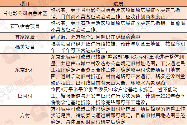 具体来看,涉及项目包括尚宾城、柏林怡园、想象国际、省电影公司宿舍片区、石飞宿舍项目、宜家家居、福美项目、东京北村、位同村、方村。