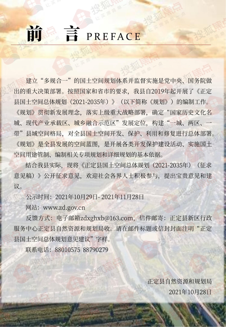 搜狐焦点“楼市快讯”报道:11月2日,搜狐焦点获悉,正定县政府网站发布了正定县国土空间总体规划(2021-2035)公共征求意见稿。