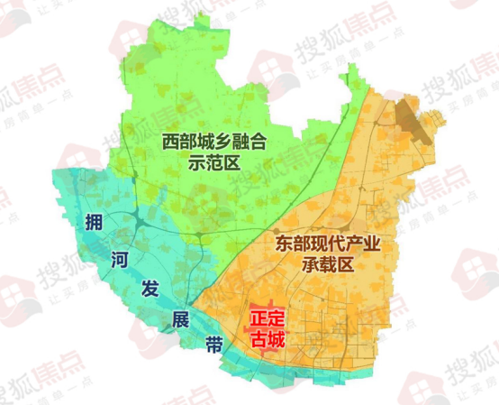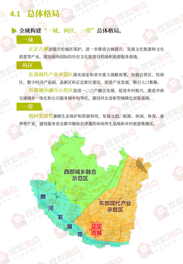 《规划》显示,全域构建"一城、两区、一带"总体格局。一城:正定古城加强历史城区保护,进一步推进古城提升,发展文化旅游和文化创意等产业,建设面向国际的历史文化旅游目的地和旅游服务基地。两区:东部现代产业承载区落实国家和省市重大战略部署,加强自贸区、综保区、数字经济产业园、高新区和正定新区建设,促进产业发展,吸引人口集聚。西部城乡融合示范区促进一二三产融合发展,促进乡村振兴,推进市政交通城乡一体化和公共服务城乡均等化,建设河北省新型城镇化试验基地。一带:拥河发展带兼顾生态保护和资源利用,发展文创、旅游、休闲、体育、康养等产业,建设服务省会都市圈和京津冀的休闲养生基地和乡村旅游集聚区。