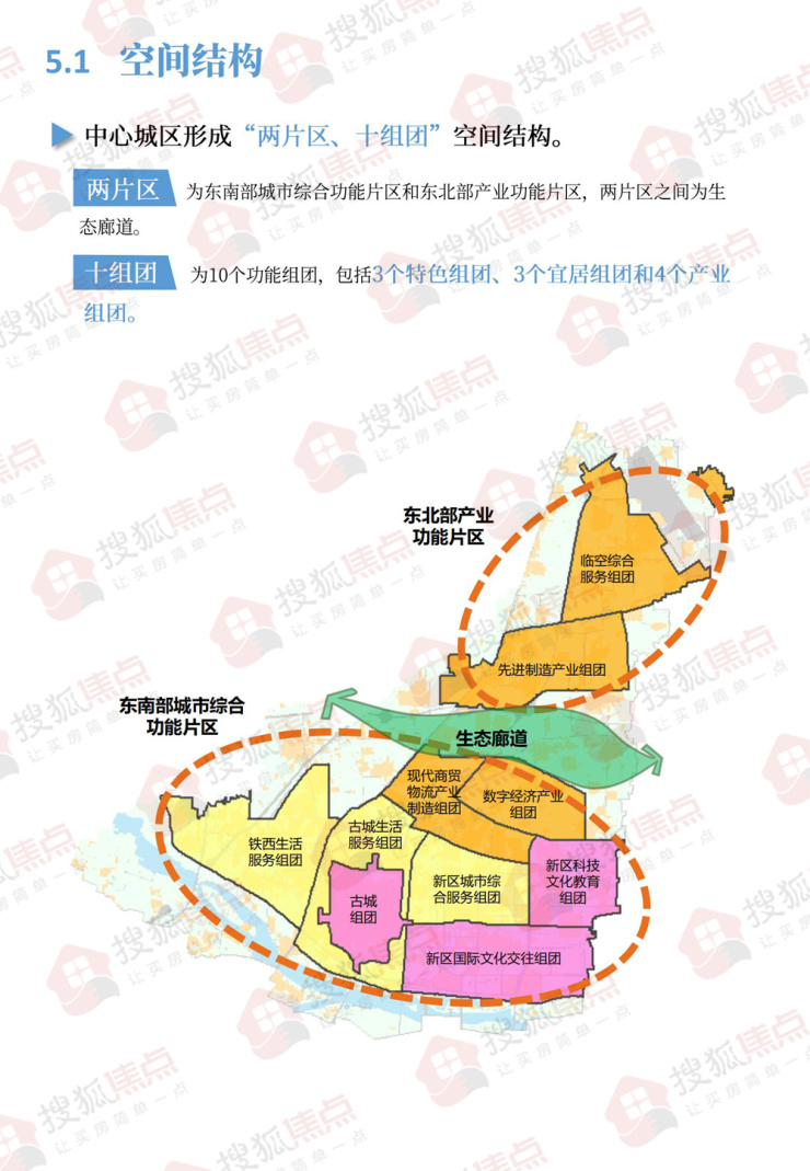 两片区为东南部城市综合功能片区和东北部产业功能片区,两片区之间为生态廊道。