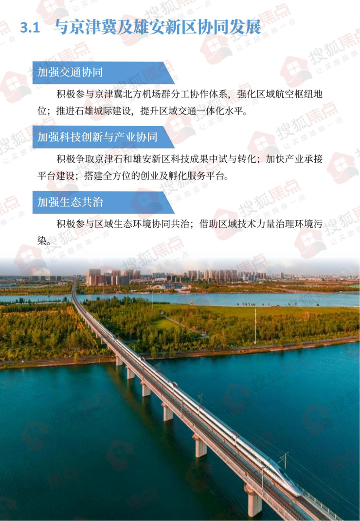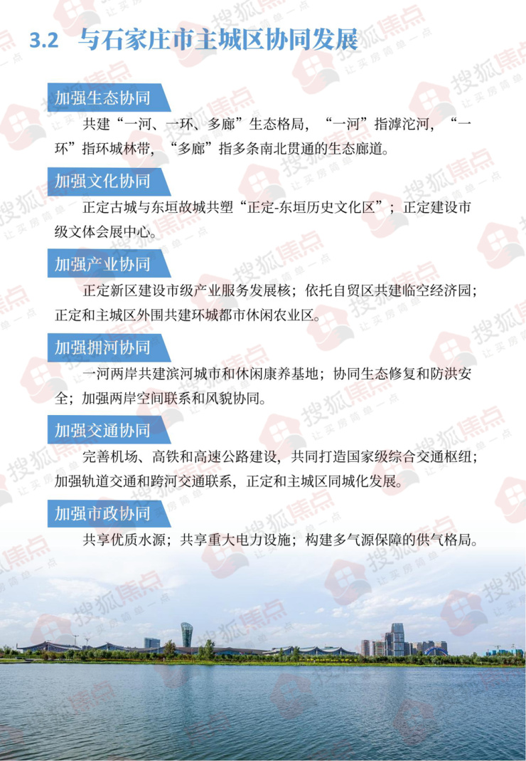 《规划》提出,将与京津冀及雄安新区、石家庄市主城区、周边区县协同发展。积极参与京津冀北方机场群分工协作体系,推进石雄城际建设。与石家庄市主城区共建“一河、一环、多廊”生态格局,正定古城与东垣故城共塑“正定-东垣历史文化区”;正定建设市级文体会展中心;依托自贸区共建临空经济园;正定和主城区外围共建环城都市休闲农业区;一河两岸共建滨河城市和休闲康养基地;加强两岸空间联系和风貌协同;完善机场、高铁和高速公路建设,共同打造综合交通枢纽;加强轨道交通和跨河交通联系,正定和主城区同城化发展。正定新区与藁城区共建高教园区、产业科研片区和生态宜居新城。