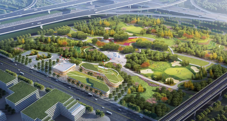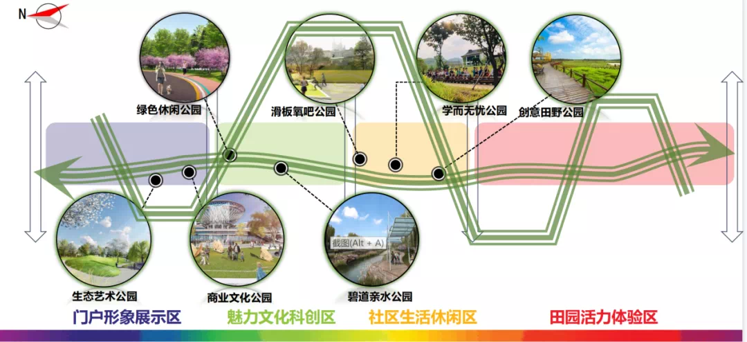 秉承“激活燕赵文化中轴,绘染太行都市画廊”的理念,以十字中枢为整体,构建双廊四带、三心四区、多节点的景观布局。新元沿线两侧布局7处景观节点,西侧3处,东侧4处;平均间距约2公里,占地118万平米,满足休闲、娱乐、健身、商业、研学、亲子等不同的服务需求。