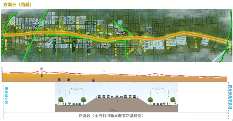 在市政化改造方面,构建拉大城市骨架、支撑组团发展的“田字形”快速系统,有效连接二环路并闭合三环路系统。同时合理布局、增设立交节点。新元城区段全线共7处互通立交,其中利用并改造既有互通立交2处,新建4处枢纽互通立交,1处一般立交。新元正定段全线共4处互通立交,其中利用并改造既有互通立交1处,新建2处枢纽互通立交,1处一般立交。石太黄石段全线共11处互通(含南高营),其中利用并改造既有互通立交7处,新建3处枢纽互通,1处一般立交。实现快速路网的高效转换。完善辅道系统,补全城市交通功能,以快线与慢网构建立体多模式复合交通走廊。