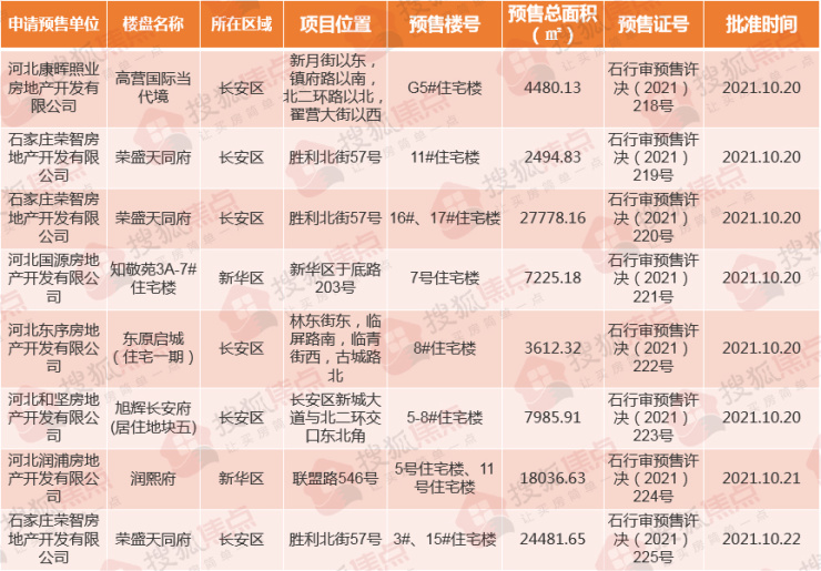 搜狐焦点“楼市快讯”报道:10月25日,搜狐焦点从石家庄市行政审批局网站了解,近日,石家庄6大项目新获8张预售证,涉及项目包括高营国际当代境、荣盛天同府、知敬苑3A-7#住宅楼、东原启城(住宅一期)、旭辉长安府(居住地块五)、润熙府。