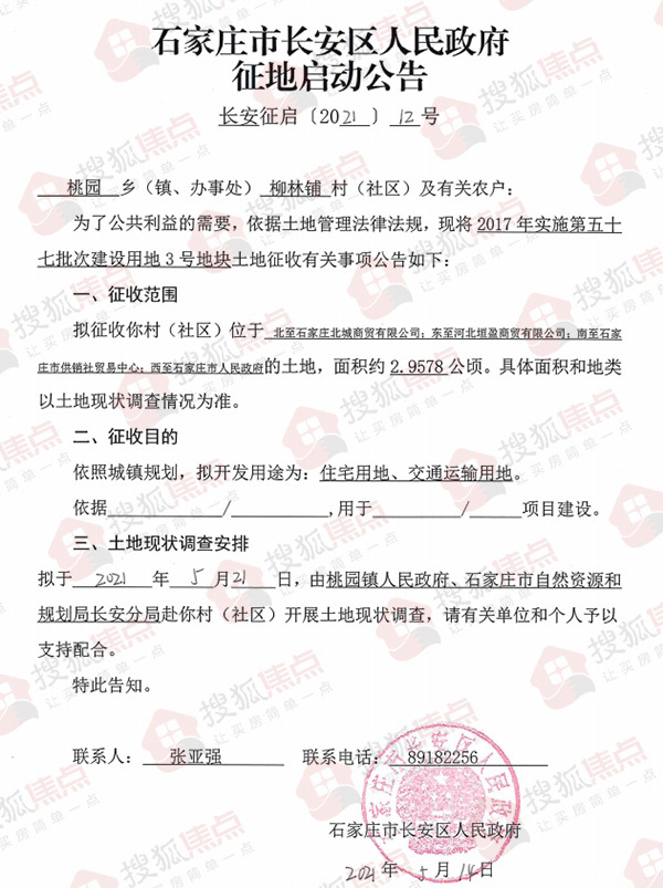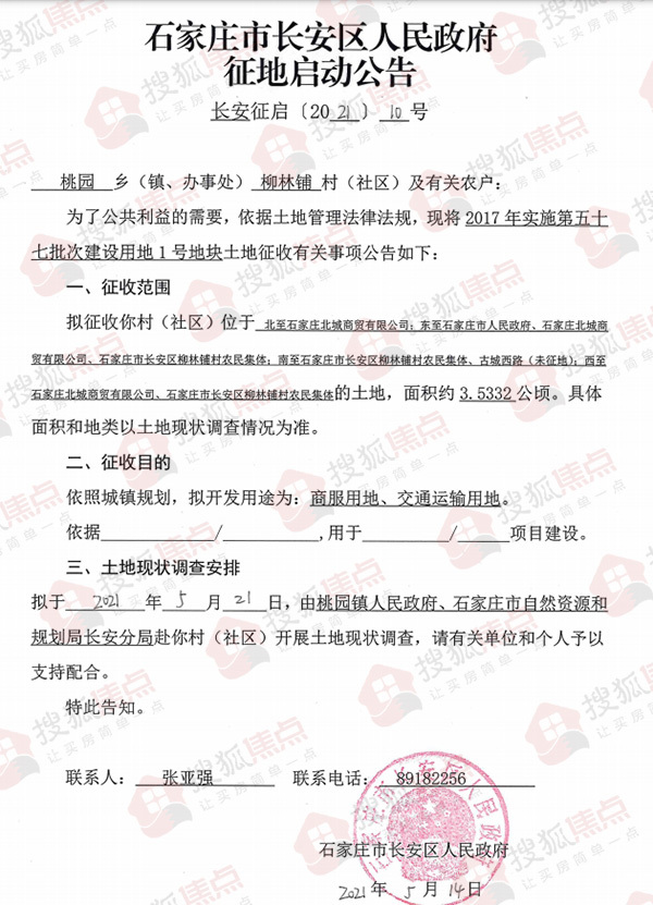 搜狐焦点“楼市快讯”报道:5月18日,搜狐焦点获悉,长安区人民政府发布了2则征地启动公告,拟征收桃园乡柳林铺村共计97.365亩地,开发用途为商服用地、住宅用地、交通运输用地。