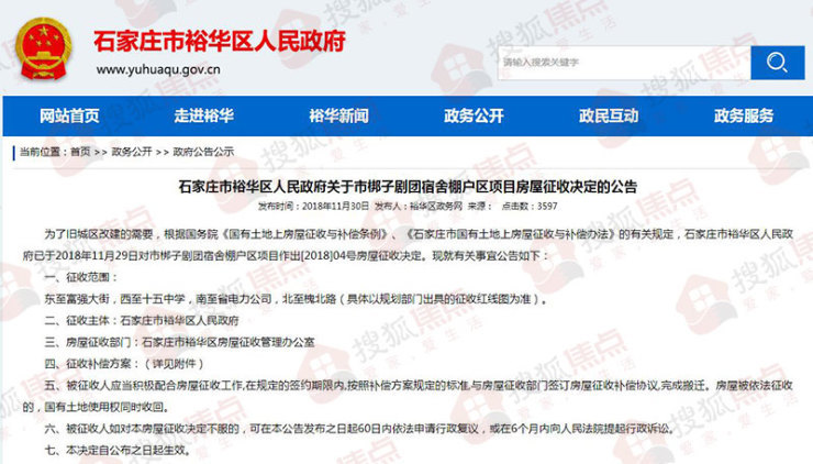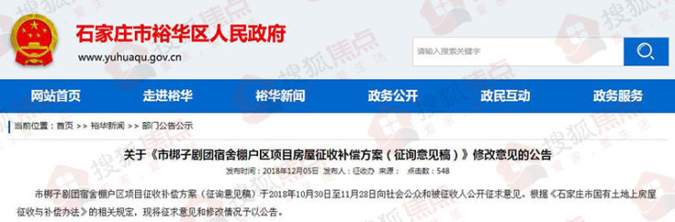 2018年11月30日,石家庄市裕华区人民政府发布了《关于市梆子剧团宿舍棚户区项目房屋征收决定的公告》。《公告》公布了市梆子剧团宿舍棚户区项目的征收范围、房屋征收主体、房屋征收部门以及居民住宅房屋征收补偿等。