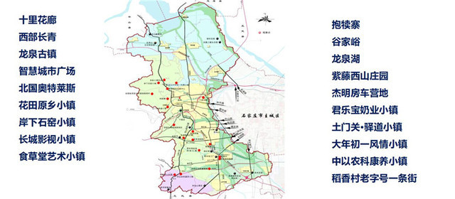据了解,本届旅发大会将重点推出19个观摩项目,由北向南依次为:大年初一风情小镇、花田原乡小镇、智慧城市广场、抱犊寨、谷家峪美丽乡村、岸下石窑小镇、土门关驿道小镇、西部长青、十里花廊、龙泉湖、食草堂艺术小镇、长城影视基地、龙泉古镇、君乐宝奶业小镇、稻香村老字号一条街、北国奥莱欢乐小镇、杰明房车木屋营地、中以农科小镇、紫藤西山庄园。这些观摩项目不仅成为鹿泉区新的旅游景点,同时也成为鹿泉旅游区的重要配套设施。