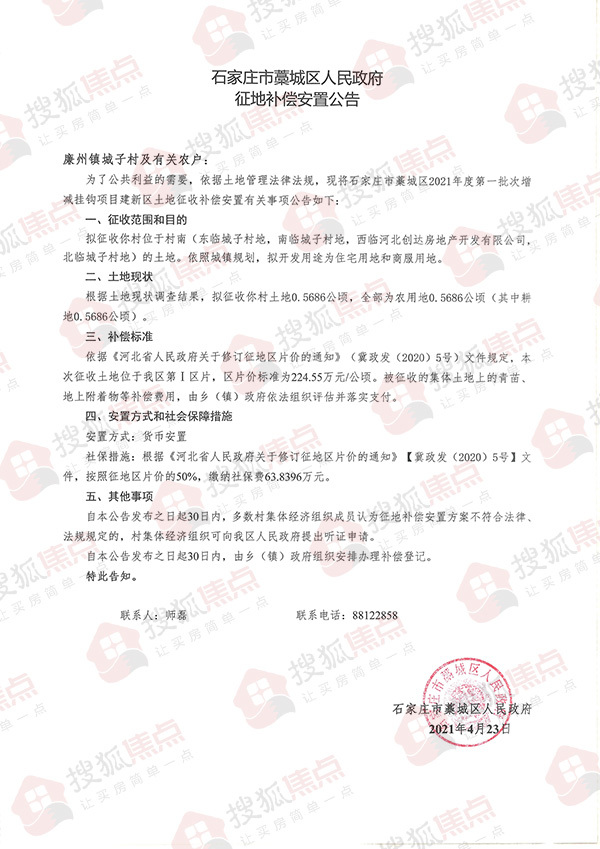 搜狐焦点“楼市快讯”报道:4月25日,搜狐焦点获悉,藁城区政府网站发布了一则征地补偿安置公告,拟征收廉州镇城子村0.5686公顷(约合8.529亩)土地,开发用途为住宅用地和商服用地。