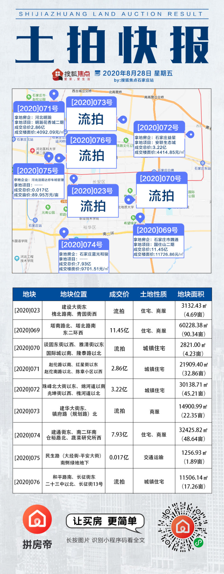 搜狐焦点“焦点地评线”报道:8月28日,石家庄主城区再次迎来一批土地出让活动,涉及9宗地块,[2020]023、069-076号,占地面积为178319.8平方米(约合267.48亩),总起始价为266550万元(26.655亿元)。