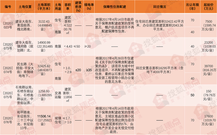 [2020]023号地块,位于建设大街东、青园街西、槐北路南,土地面积为3132.43平方米(约合4.70亩),用地性质为住宅、商服,住宅建筑面积≤32200.76㎡,根据2017年4月14日市政府关于保障房配建政策的签批意见,棚户区改造项目不再配建保障性住房,出让年限分别为70年、40年,起始价为7500万元(1595.74万元/亩)。