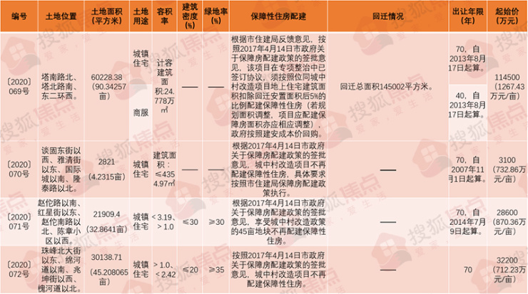 [2020]069号地块,位于塔南路北、塔北路南、东二环西,土地面积为60228.38平方米(约合90.34亩),用地性质为住宅、商服,计容建筑面积为24.778万㎡,根据市住建局反馈意见,按照2017年4月14日市政府关于保障房配建政策的签批意见,该项目在专项整治中已签订协议,须按照位同城中村改造项目地上住宅建筑面积扣除回迁安置面积后5%的比例配建保障性住房(若规划面积调整,项目应配建保障房面积亦应相应调整),政府按照建安成本价回购。出让年限为70年(自2013年8月17日起算)、40年(自2013年8月17日起算),起始价为114500万元(1267.43万元/亩)。