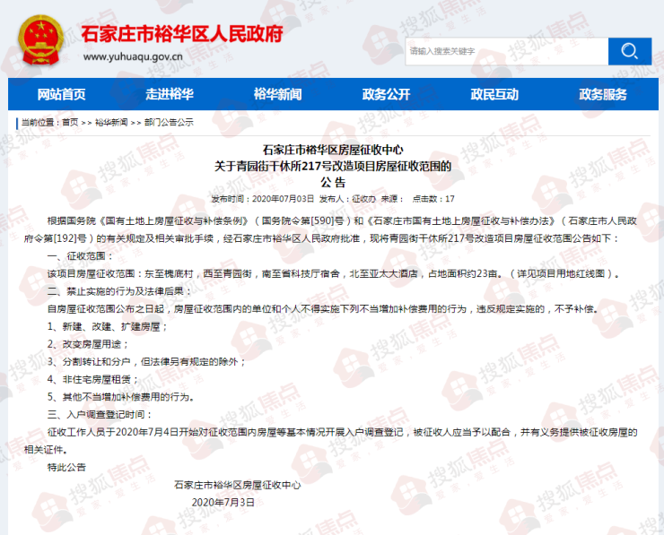 搜狐焦点“楼市快讯”报道:7月3日,搜狐焦点获悉,石家庄市裕华区房屋征收中心发布《关于青园街干休所217号改造项目房屋征收范围的公告》。