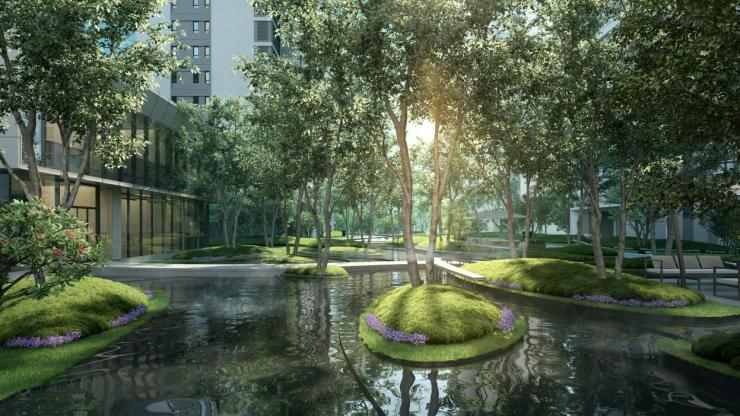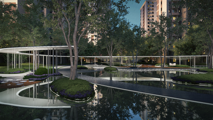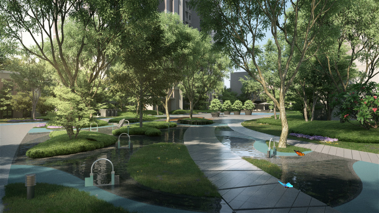 约7200㎡的森居景观轴,比一个标准足球场的面积还要大。园区正中间是占地约2300㎡度假式水庭,引入了雾森系统还特别设计了多个伴水平台、下沉式水岸景观,满满的度假风,这里将成为业主的休闲社交平台。