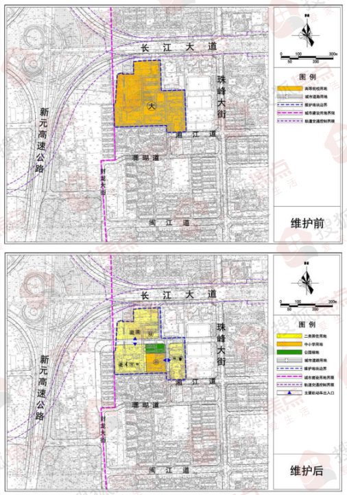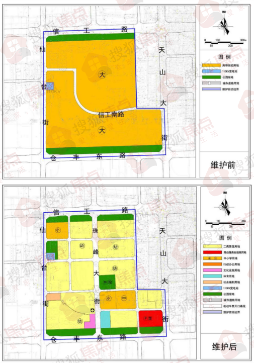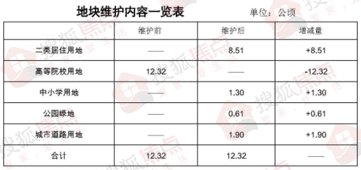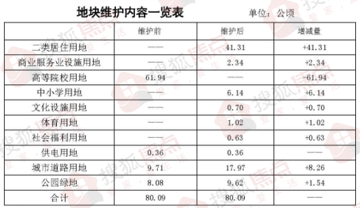 该地块维护后,二类居住用地增加8.51公顷(约合127.65亩),高等院校用地减少12.32公顷(约合184.8亩),中小学用地增加1.3公顷(约合19.5亩),公园绿地增加0.61公顷(约合9.15亩),城市道路用地增加1.9公顷(约合28.5亩)。